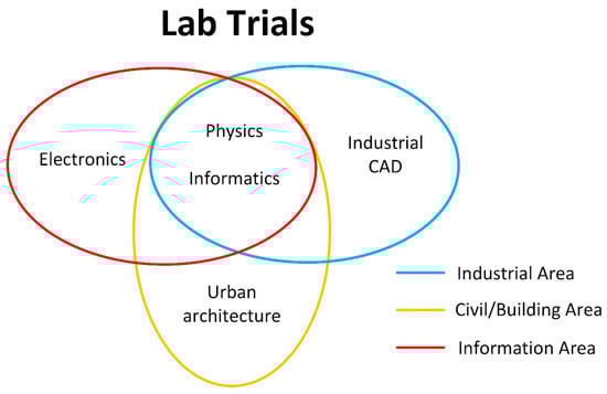 The degree courses of the department were grouped into three areas: Information (electronics, informatics, and bio-engineering), civil/building (civil, and building engineering), industrial (industrial, mechanics, naval, and management). As schematized in Figure 3, two laboratory tests were designed on courses common to all areas (physics and computer science); the other three tasks were chosen so as to each be a “workhorse” for one area and a new topic for the other two, and in order to generate curiosity and involvement. In detail, an electronics task was chosen, characteristic of the information area, to stimulate the spirit of observation and the ability to optimize; an urban architecture task was chosen, characteristic of the civil/building area, to involve the students for the curiosity of better knowing their city; and an industrial 3D CAD (computer aided design) task was chosen, characteristic of the Industrial area, that could be also useful in the other areas.