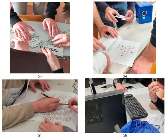Details of the execution of the four logic/basic subjects tests. (a) Puzzle with mathematical analysis theorem; (b) symbolic calculation to open a safe; (c) labyrinth with phone number sequence; (d) unlocking of PDF files on PC by answering physics questions.