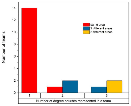 Composition of the teams. Briefly, 14 teams were made up of students from the same degree program; 1 team of students was from two different degree courses belonging to the same area; 2 teams of students were from 2 different degree programs belonging to 2 different areas; 1 team of students was from 3 different degree courses belonging to 2 different areas; 2 teams of students were from 3 different degree courses belonging to 3 different areas.
