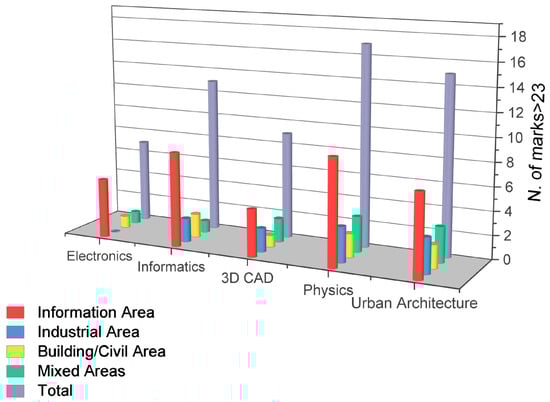 As is evident from Figure 9, the two tasks designed on topics common to all degree programs had good results for more than half of the teams. The physics trial had good marks registered for 17 teams out of 20, with the informatics having good marks registered for 13 teams. An excellent result for urban architecture was registered as well. Although it is a characteristic subject of the civil/building area, the test having been calibrated on buildings and monuments of the city, it was passed by most of the students (15 teams out of 20) with satisfactory results. The two more specialized tasks, namely electronics and 3D CAD, ended with “good” results for less than 50% of the teams. This was probably foreseeable given that the degree of difficulty of these trials was higher. In particular, for the electronics trial it was verified that many teams (from all areas) making a mistake in assembling the connections burned the integrated circuit and consequently failed to make the circuit work. However, we want to underline that the civil/building team that had good results obtained the highest possible mark in the electronics test, that is, 30/30 with honors.