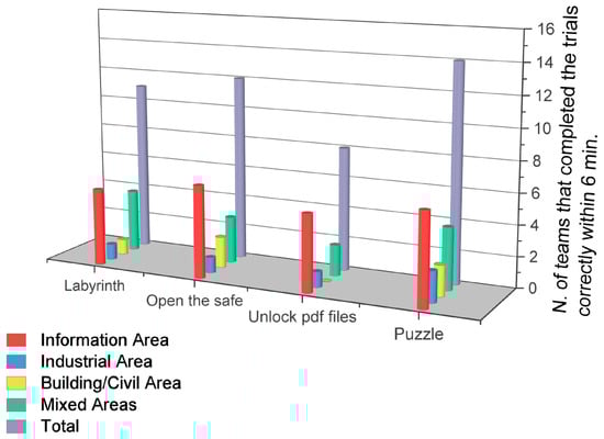 Number of teams that completed the logic/basic subjects trials within 6 min, per area. Although not evident from the figure, almost all teams completed the tests in the allotted time. What emerged is that the greatest difficulty in the games was understanding what to do, not how to do it. However, this is precisely a feature of escape rooms.