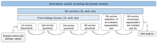 The experimental phase of the study consisted of six sixty-minute sessions (see Figure 1). The first four sessions comprised an introductory theoretical lesson followed by three practical sessions. During these sessions, students received instruction on what historical thinking is and its application in history teaching through the analysis of historical resources. The objective was to teach students the skills to write argumentative texts while considering the various dimensions of historical thinking based on Seixas and Morton [41]. Following these sessions, the fifth session of the research involved a task where students were required to compose an argumentative text. The specific objective of this session was to assess the students’ ability to construct a good historical narrative based on the translated abstract of the article authored by Kesternich et al. [45], which explores the consequences of World War II. In this session, exam conditions were simulated. Students were strictly prohibited from using any materials other than a pen or pencil and a rubber. The use of any additional materials would lead to the exclusion from the data collection for this study.