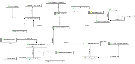 A lack of qualitative studies examining adolescent students’ voices regarding the contextual, relational, and self-regulatory factors that drive their language achievement has been observed. Therefore, the present study aimed to address this issue. Sixteen face-to-face semi-structured interviews were conducted with secondary school students in Greece to document and analyse their perceptions of the factors that influence language achievement. The study was guided by social-cognitive theory and models of self-regulated learning. Computer-assisted thematic analysis was performed using abductive open coding followed by refinement of codes. Three overarching global themes were identified in line with theoretical expectations, namely personal factors (motivation and self-regulatory strategies), relational factors (teachers’ practices, parental achievement expectations, peer influences), and structural factors (the educational system). Afterwards, an abductive thematic network analysis was conducted to explore and theorise about potential relationships between the emergent themes in the data. It was found that parental expectations for higher performance and the teachers’ behaviours were associated with students’ language achievement. Task-related characteristics and peers influenced students’ regulation of effort in learning. The students believed that they were not objectively graded and frequent summative assessments created test anxiety. The findings are discussed in light of existing empirical evidence and in terms of educational implications.