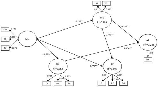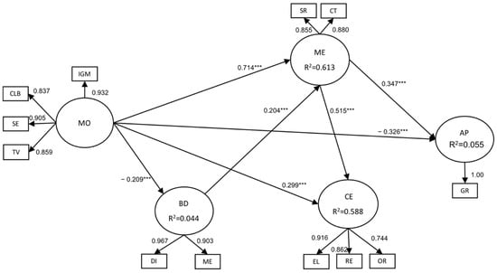 Resulting model obtained from the use of the gamified platform *** p < 0.001. Motivation (MO), behavioral disengagement (BD), metacognitive engagement (ME), cognitive engagement (CE), and academic performance (AP). Extrinsic goal motivation (EGM), self-efficacy (SE), task value (TV), distraction (DI), mentally (ME), passivity (PA), self-regulation (SR), critical thinking (CT), organization (OR), elaboration (EL), rehearsal (RE), and grade (GR).