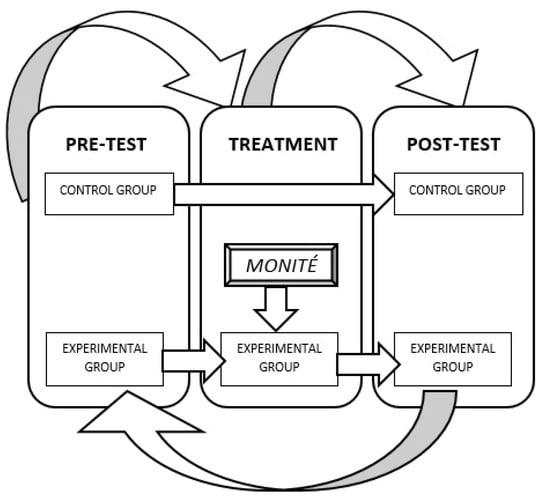 The study presented in this article was developed with a quasi-experimental approach with a pre-test–post-test design and a non-equivalent control group. Established (unaltered) groups were selected, to which the following procedure was applied: a pre-test, a treatment, and finally, a post-test (see Figure 1).