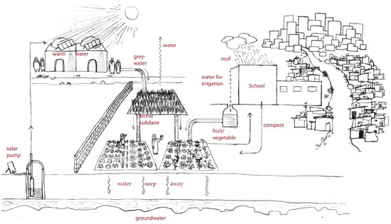 29]. To promote energy efficiency and reduce the environmental impact of the project, water from the local hammam is treated in a constructed wetland and reused for irrigation purposes in the community garden. Furthermore, solar thermal collectors will be installed on the hammam’s roof to replace the traditional wood-burning oven and heat the bath water [