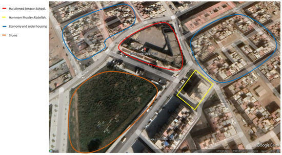 Figure 5 illustrates the school environment, reflecting the surroundings experienced by the students and influencing their daily lives. Notably, the presence of a hammam is depicted, serving not only as a traditional space but also as a vital hygiene resource for individuals who lack access to showers or hot water. The diverse housing structures featured in the image indicate that the public school accommodates students from various socio-economic backgrounds, each with distinct means and levels of sanitation infrastructure incorporated into their everyday routines.