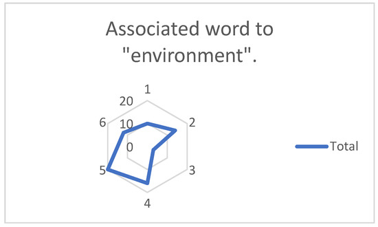 Figure 7 present the results of the third section of the questionnaire, which asked students to name at least two words they associated with the word “environment”. The responses were then grouped into six categories based on their definitions, and each category was assigned a number to allow for correlations between the responses. The most frequently mentioned categories were water and flora, which are related to nature and public health. The number of responses in each category is provided in