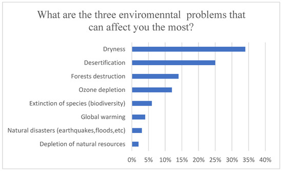 Figure 8, the questionnaire also aimed to identify the environmental issues that students perceived as having the most significant impact on their lives. The results indicate that water scarcity and desertification are the top environmental issues that students are concerned about, with 34% and 25% of respondents selecting them as the most pressing issues, respectively. These findings are in line with the challenges that Morocco is currently facing, as the country is among the most water-scarce countries in the world and climate change is expected to have severe consequences on the country’s economy, society, and environment [