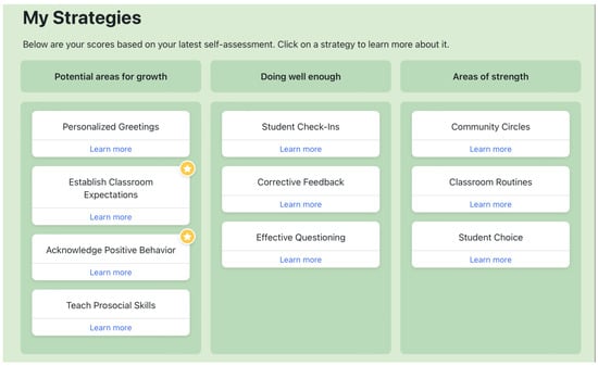 Based on their ratings, teachers were presented with a personalized strategy profile, which displayed each of the strategies in one of three columns: Areas of Strength, Doing Well Enough, and Potential Areas for Growth (see Figure 1). Strategies that the teacher reported using rarely or sometimes and/or those they reported they could improve their use of were assigned to the Potential Areas for Growth column. If the teacher reported they were doing pretty well combined with rarely or sometimes using the strategy, the strategy was assigned to the Potential Area for Growth column. If teachers reported they were doing pretty well with a strategy and that they used the strategy at least half of the time, the strategy was assigned to the Doing Well Enough column. If teachers reported that the strategy was an area of strength and reported using the strategy at least half of the time, the strategy was assigned to the Areas of Strength column.