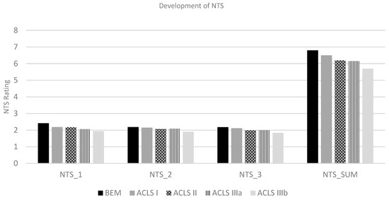 The greatest improvement of NTS was observed in dimension one. Also, on this dimension, the NTS performance of the last training (4th year) was significantly better than the performance of undergraduates in their 1st, 2nd and 3rd year training. The undergraduates improved significantly from their 1st (BEM), to their 4th year (ACLS IIIa, p = 0.007; ACLS IIIb, p < 0.001) training, with mean differences of 0.363 (95%-CI [0.07, 0.66]) (ACLS IIIa) and 0.481 (95%-CI [0.20, 0.76]) (ACLS IIIb) AS-NTS score points.