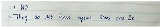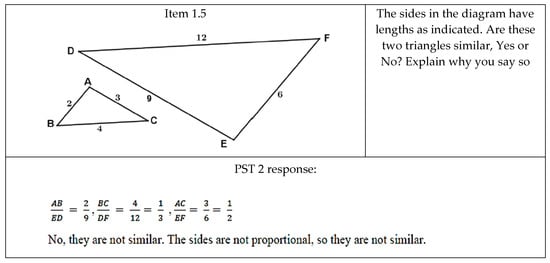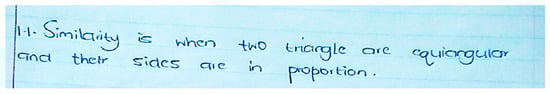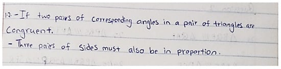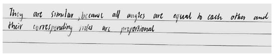 Item 1.2 was experienced as the third easiest, with 88% of the group providing the correct answer. The question for Item 1.2 was: State the conditions required to show that two polygons are similar. Most were able to state the two conditions that corresponding pairs of angles and sides should be equal and in proportion, respectively. This showed that they were comfortable with the non-minimal nature of the definition of similarity that they first encountered, similar to the study in [7]. Some who did not get it correct limited their descriptions of the concept of similarity to triangles only, as shown in Figure 1.