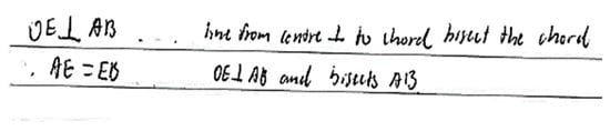 The student wrote: OE AB with the reason “line from centre to chord bisect thchord”, therefor AE = EB with the reason ” OE AB and bisects AB”. That is PST7 claimed OE AB because the line from the centre perpendicular to a chord bisects the chord. What is missing is the reason why OE is perpendicular to AB. Instead, it seems to be presented as a known fact. This response illustrates the Department of Education’s [27] assertion that the structured requirements of providing appropriate reasons for statements make this subject section seem complicated. Furthermore, the result is consistent with findings [13] which revealed that school learners struggle to answer proof questions, especially when more than two steps are required. Despite spending years at secondary school and a semester at university, it can be seen in this study that many of the PST’s have not yet developed an understanding of the nature of geometric proofs.