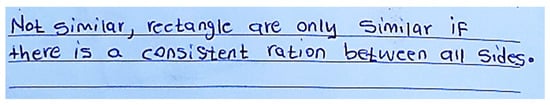 As seen in the interview above, PST7 firmly believed that the corresponding sides would always be in proportion for any two rectangles. However, when PST7 was presented with a counterexample of two rectangles whose corresponding sides were not in proportion, he agreed that any two rectangles are not necessarily similar. Another student, PST29 (Figure 5), did realise that the sides may not always be in proportion but could not express his argument precisely: