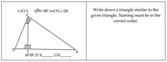 The challenge was related to identifying the corresponding pairs of equal angles, which would help to name similar triangles correctly. Students often need to engage in dimensional deconstruction in order to attend to the properties of figures [32]; for example, in Items 2.4 and 2.5, where the three triangles overlapped, students needed to deconstruct or separate the three triangles in their minds and re-orientate them so that they could see the triangles separately. This task of dimensional deconstruction of figures is made more difficult when triangles share parts (lines or angles), that is, when they have a common side or common angles. A study [33] found that students commonly identified intersecting lines as a shared side and a combination of two angles, with one falling in the one triangle and the other in the second triangle, as being shared or common. Likewise, in another study [9], a student who initially was unable to identify the correct naming order of the pairs of similar triangles was successful after creating physical triangles that could be manipulated to identify the pairs of equal angles. The manipulations allowed him to visualise the similarity relationship between the triangles by seeing them as reductions of the outside triangle.