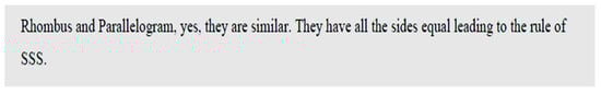 Understanding the notion of class inclusion of shapes is vital in geometry because it enables one to reason about the relationship between geometric shapes and their properties. Class inclusion reasoning is usually developed as students advance to the informal deduction level, as described by van Hiele. If they have not developed informal deduction reasoning skills, they are unlikely to understand the notion of class inclusion. In this study, a few items required an understanding of quadrilaterals (Items 1.3 and 1.4). The students PST 6 and PST 9 showed misconceptions about the class inclusion of quadrilaterals, as shown in Figure 9 and Figure 10. Participant PST 6, when asked about the similarity of squares in Item 1.3, gave a response about rhombus and parallelograms (Figure 9), while PST 9 (Figure 10), when asked about the similarity of squares, spoke about a rhombus and rectangle. Furthermore, when asked about the similarity of rectangles, participant PST9 referred to the properties of a rhombus and parallelogram.