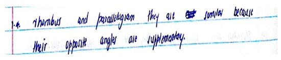 It seems that the student PST 6 tried to use a rhombus and parallelogram as illustrative examples of the class of squares or rectangles; however, the error is that a rhombus and parallelogram are not included in the class of squares or rectangles. These participants were trying to consider all quadrilaterals, which belong to a family of squares and rectangles, but could not comprehend the relationships between the classes of figures. They could not identify which sets of quadrilaterals were included within the other. It seems that they have not developed the appropriate reasoning consistent with the Informal deduction level about the concept of class inclusion.