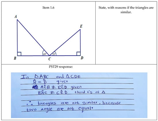 Students found Item 3.2 relatively easy; this may be because proving that a pair of triangles is similar is a well-known procedure that they have mastered since this type of question is frequently encountered in secondary school. Additionally, the order of the naming was provided in the instruction. Ubah and Bansilal [9] also noted that the students in their study found it relatively easy to show similarity in the same situation.