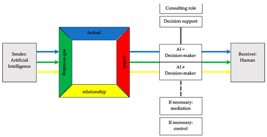 This study reveals that the four-sides model proves suitable for analyzing communication between an AI sender and a human receiver. However, we have identified transparency as a pivotal factor in ensuring a high level of acceptance in the context of AI’s role in decision-making processes. To analyze achieved acceptance, the well-established technology acceptance models (TAMs) can be utilized, albeit with the incorporation of additional factors necessitated by the need for heightened transparency.