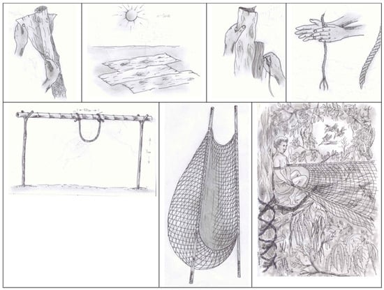 Steps. The removal of the bark, drying it in the sun, making it into fibres and twisting it into rope. The preparation to make the net and the finished net with the poles. A person who has climbed the wooden steps to the tree branch and waiting for the birds.