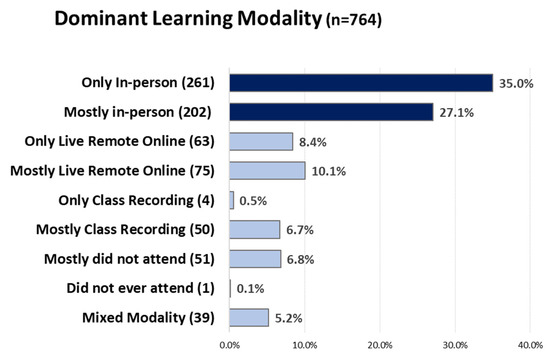 Most students reported participating predominately in-person (62%). Another 18% of the students attended class only or primarily online. Of importance is the fact that less than half (329, or 44% of the students) indicated they participated in class consistently via one modality. For example, the dominant modality for 62% of the students was in-person. However, only 56% of these students (261, or 35% of all students; see