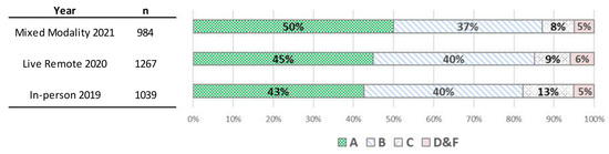 Descriptive statistics were used to identify and compare students’ preferred modality and whether their preferences changed over the course of the semester. We also examined whether their actual behavior matched their stated preference. Achievement data were analyzed and compared in aggregate for each of the three years. Achievement from 2021 was analyzed using regression analysis, ANOVA, and a Chi-Squared analysis. The regression analysis was used to determine whether student characteristics and modality choice predicted student achievement. The ANOVA was used to ascertain whether average class achievement differed statistically by modality behavior. The Chi-Squared analysis was used to determine if the number of students receiving a specific letter grade differed statistically by dominant attendance modality.