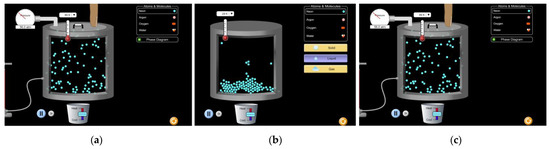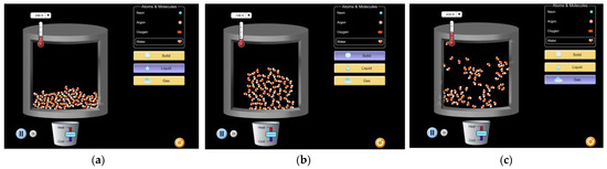 PhET simulation for the application of heat to instigate a change in matter states. (a) The substance in its solid state, (b) the substance in its liquid state, (c) the substance in its gaseous state.