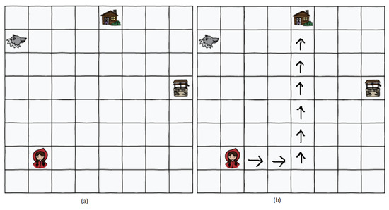 Later, the shortest path concept was discussed in a 5 min lecture. To reinforce the idea, interactive training was given to students. The students were asked to move in the classroom from one place to another using different directions while counting the steps and avoiding any hurdles. Their Math teacher performed this activity, and we provided the prior training to the instructor. The students also practiced understanding the concept by changing the possible set of moves; for instance, they were allowed to move diagonally or move back, and so on. After 40 min of practice, students were asked to perform the post-activity. We chose the Rescue Mission activity from the CS-Unplugged project [32] for the post-activity. The idea of a rescue mission using kid bots was explained to students by retelling the story of Red Riding Hood. The students could only move in four directions (up, down, left, and right). This activity was originally created and tested in developed countries like New Zealand. The suggested duration is 30 min, and the target age is specified as 5–7. We performed this activity on older kids, keeping in mind the local educational framework, and the training process took 40 min. The post-training activity and a possible solution are shown in Figure 3.