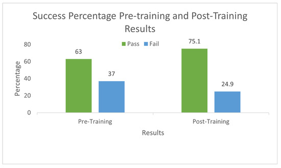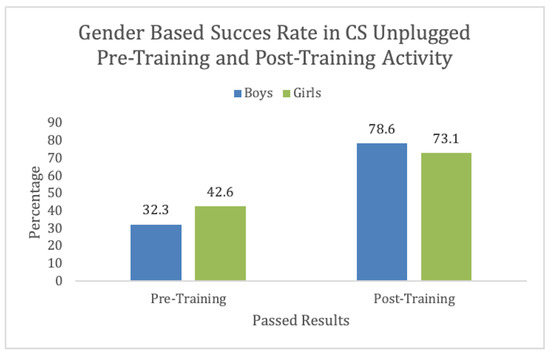 The bar plot in Figure 6 depicts the pass or fail percentage among girls and boys. We observed that 32.3% of the boys passed the pre-training activity. On the other hand, 43.6% of the girls passed the pre-training. In the post-training activity, 78.6% of the boys passed, and 73.1% of the girls passed the post-training activity. We can observe from the data that training was more useful for the boys than the girls. This depicts that both genders found the training useful with more than 70% increase in success rate. Notably, the success rate was lower in females. Similar results can be found in [8], where when CTt was conducted, females scored 1 point less than boys. This provides an opportunity to improve training for better inclusion.