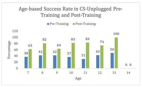 The experiment was conducted on students aged 7–13, as shown in Figure 7. We found that this activity was easily understandable for the age group 10–11. We had one 14-year-old student who could not pass the activity even after the training. This might be due to any other unrelated issue. For our further analysis, we excluded this student from our data set. However, training was effective for all ages.
