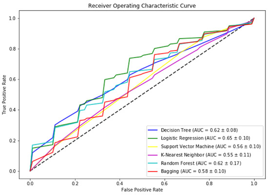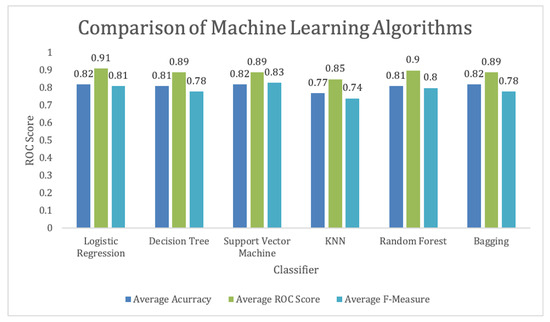 We can achieve above 70% accuracy using most of the selected algorithms. Similarly, the highest F-measure is achieved by the SVM. We can observe that logistic regression is performing best to predict which student will pass the test once the training is provided for the CS unplugged activity, as shown in Figure 9. Regarding the ROC score, as shown in Figure 10, we can see that logistic regression has the highest score. These results show the prediction of student performance based on past results and age, gender, and academic level.