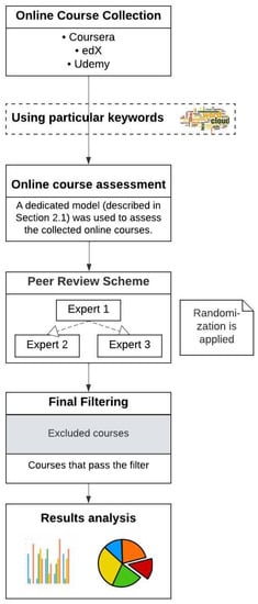 In this section, the steps followed, as well as the model used for the assessment of online courses, are presented in detail. More specifically, as depicted in Figure 1, the design of this evaluation study comprised the following steps:
