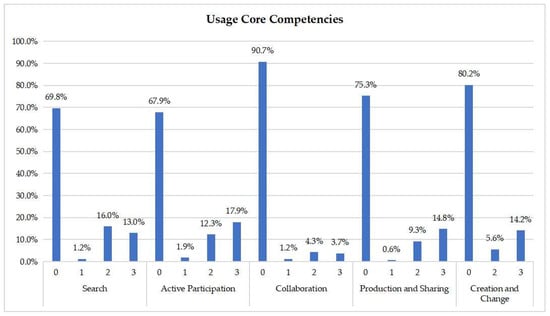 Figure 3 presents the assessment of the attributes of the usage core competences category. It shows that the majority of the courses does not sufficiently cover the skills in this category. This is especially true for the “collaboration” skill, which is covered by less than 1 out of 10 courses. On the other hand, “search” and “active participation” are the best-covered skills in this category, with approximately 3 out of 10 courses being relevant (to a medium or high degree) to their teaching.