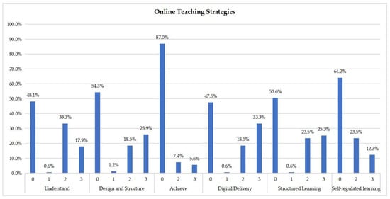 Figure 4 presents the assessment of the attributes in the online teaching strategies category. It can be noted that, in particular, the “achieve” skill is not sufficiently covered, in comparison with the others. On the other hand, “digital delivery”, “understand”, and “structured learning” are among the best-covered skills in this category, with approximately one out of two courses being relevant (to a medium or high degree) to their teaching.