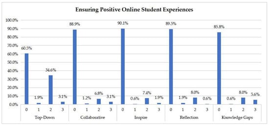 Figure 5 presents the assessment of the attributes related to ensuring positive online student experiences. It shows that the majority of the courses does not sufficiently cover the skills in this category. This is especially true for the “collaborative”, “inspire”, “reflection”, and “knowledge gaps” skills, which are covered by less than 10–15% of the investigated courses. On the other hand, the “top-down” skill is the most widely covered in this category, with approximately 4 out of 10 courses being relevant (mostly to a medium degree) to its teaching.