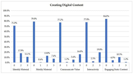 Figure 7 presents the assessment of the attributes related to the creating digital content category. It shows that the majority of the courses does not sufficiently cover the skills in this category. This is especially true for the “engaging static content” skill. On the other hand, the “identify material” skill is the best-covered in this category, with almost 3 out of 10 courses being relevant (to a medium or high degree) to its teaching.