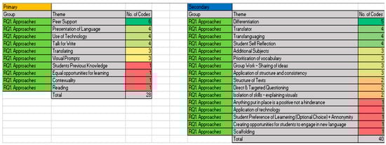 The second research question highlighted peer support, differentiation, and the use of technology as the highest-rated themes for teaching approaches used for both sets of learners. Collaboration among peers was significant in supporting learners’ progress, while differentiation was crucial in meeting both sets of learners’ attainment needs. Technology played a role in facilitating differentiated instruction, requiring ongoing teacher training and student familiarization.