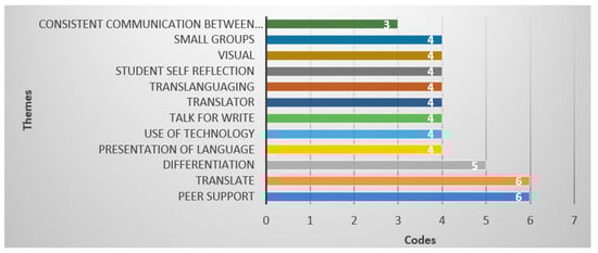 The primary objective of the first research question was to gain insight into the prevalent teaching approaches employed by teachers when instructing native English and EAL students in international education. Figure 4 presents the recurring themes that emerged consistently during the three focus group discussions. Notably, the practice of translating in the classroom was identified as the most commonly used approach by teachers to ensure accurate information attainment and effective management of both sets of learners. Additionally, the figure provides a visual representation of the themes that received the highest number of codes across all focus group discussions, emphasizing the significance of peer support for both native English and EAL students, which was considered equally important to the use of translating. Specifically, one participant from the first focus group highlighted that “…one of the things that stood out to me was how the students themselves started forming study groups. They’d gather during breaks and -sometimes- after school, helping each other out with understanding concepts and practicing the language. It’s like they took ownership of their learning process, and it really made a difference…”.