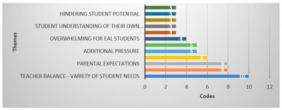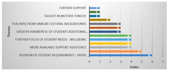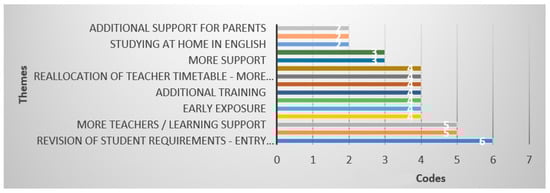 Figure 10 presents a distinct perspective on the most critical aspect to consider for the development of learning attainment, indicating that the revision of student requirements was the most frequently discussed theme, closely followed by the need for the further alignment of the curriculum. This analysis served as a bridge to the fourth research question, which asked participants to propose future developments in the way international education approaches both EAL and native English speakers in the classroom.