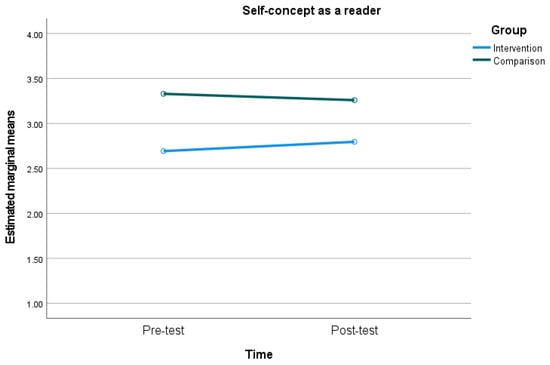 However, for self-concept as a reader, there was a significant Time × Group effect, F(1, 345) = 7.778, p = 0.006, pη2 = 0.022. As can be seen in Figure 5, in the post-test, there was a decrease in the gap between the intervention and the comparison groups in terms of their self-concept as readers.