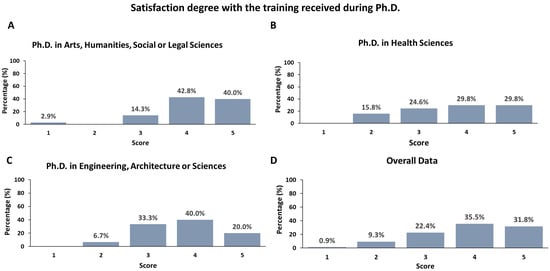 With an overall mean score of 3.8 (Table 3), two-thirds of the participants (67.4%) showed high satisfaction levels (values 4 or 5 on the Likert Scale) with the training received during their doctorate (Figure 1). The Ph.D. graduates in the areas of Engineering, Architecture, or Sciences and the areas of Arts, Humanities, and Social or Legal Sciences showed the lowest and highest mean scores, respectively, with values of 3.3 and 4.2 (Table 3).