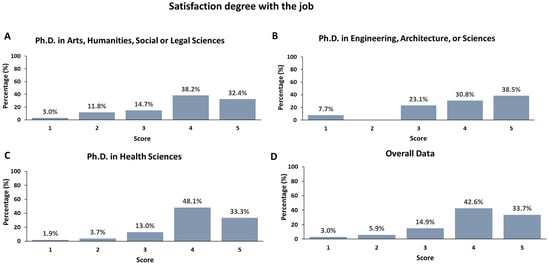According to the area of knowledge of the Ph.D. studies carried out by the participants, they were split into three groups: (i) Ph.D. in Arts, Humanities, and Social or Legal Sciences; (ii) Ph.D. in Engineering, Architecture, or Sciences; and (iii) Ph.D. in Health Sciences. The data obtained from the questionnaire were analyzed globally and per area of knowledge using descriptive statistics. The Chi-squared test was applied to determine whether there were any statistically significant differences between categorical variables. Spearman’s correlation coefficient was used to analyze the correlation between the Likert-type questions related to the satisfaction degree of the participants with their current employment. Using the Mann–Whitney U test, the medians of satisfaction of men and women were compared on a median basis. p-values below 0.05 were regarded as significant. The IBM® SPSS Statistics program, version 27, was used to conduct the statistical analyses.