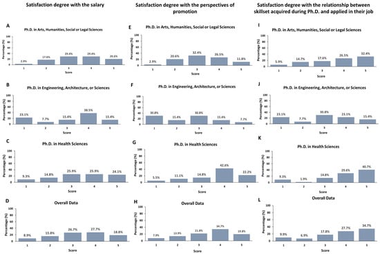 Finally, the participants reported a high level of overall satisfaction with the jobs secured after their Ph.D. (Figure 2 and Table 3). On average, Ph.D. holders showed a score value of 4. However, the level of satisfaction was lower with certain components of their job, such as salary, prospects for promotion, or the link between skillset acquired during Ph.D. and applied in the job (Figure 3), being the lowest satisfaction degree in the Ph.D. graduates in Engineering, Architecture, or Sciences, with a mean score of 3.0 for satisfaction degree with the link between skillset acquired during Ph.D. and applied in their job and 2.53 for satisfaction degree with their prospects of promotion.