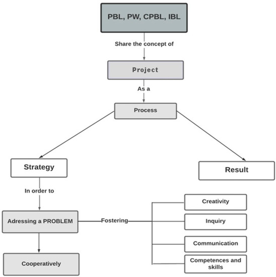 One of the conclusions we reached was that the project, in terms of its denomination and internal relationships, can be considered as the overarching concept, with PBL, CPBL, and IBL as subconcepts, with the latter being seen as a consequence of Project-Based Learning (PjBL). It was found to stimulate creativity, inquiry, communication, and diverse learning.