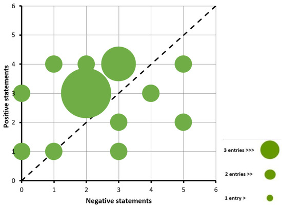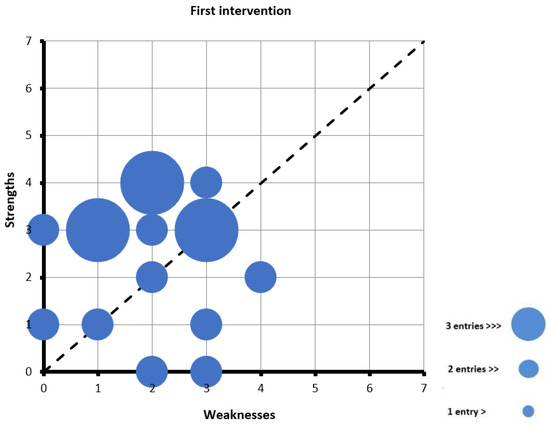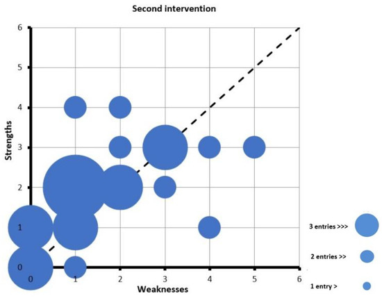 The number of statements collected from the researcher’s diary with a positive connotation (strengths and opportunities) as opposed to those with a negative connotation (weaknesses and threats) were 45 and 40, respectively, in the first intervention (Table 3), with the sum of strengths and opportunities being slightly higher. In the second intervention, there were 46 (statements with a positive connotation) compared to 45 (negative connotation), giving a nearly balanced situation between the two (Figure 4 and Figure 5).