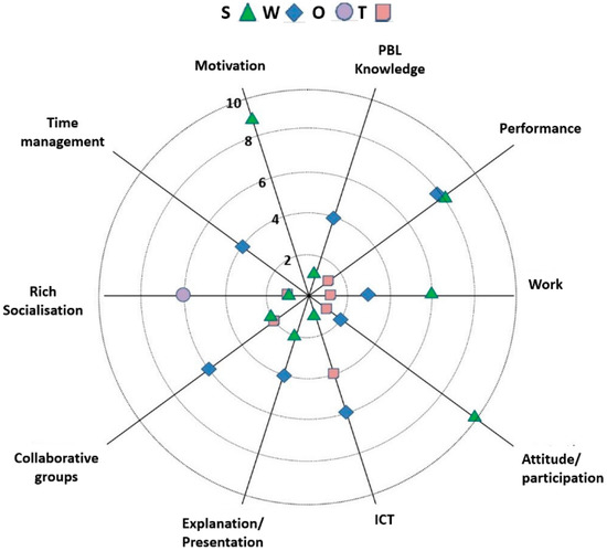 - Comparison and graphic representation of the frequency of positive (strengths-opportunities, S-O) and negative (weaknesses-threats, W-T) statements in order to determine the general perception (positive or negative) of the teaching–learning process.
