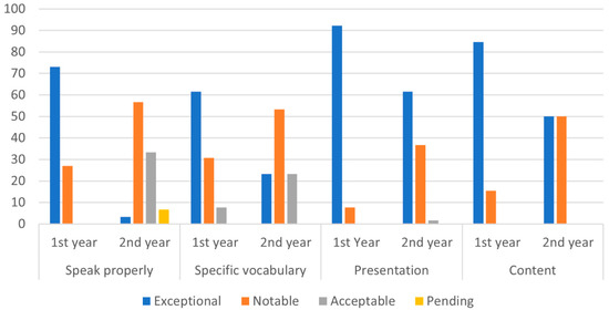 Finally, it is necessary to refer to the completed rubrics. The audience’s assessment was positive in all aspects considered in the relevant rubric for both years. There is a similar behaviour in both years of intervention since the Speak properly and Specific vocabulary sections were less valued than the Presentation and Content sections. However, there were nuances depending on the intervention since those evaluations considered as excellent in all the sections of the rubric were much more frequent in the first year of intervention, this being especially notable in the facet of They speak properly.