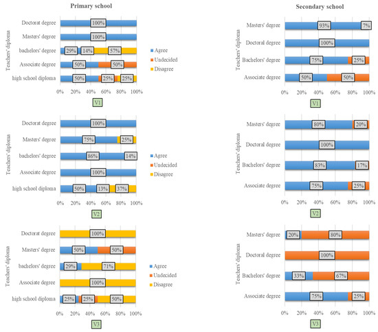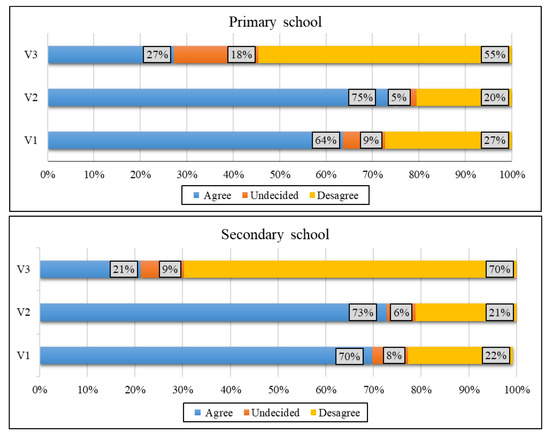 The analysis of the opinions of the surveyed teachers (Figure 1) focuses on the degree of concordance or discrepancy with the three above-mentioned different proposals in the definition of the concept of biodiversity. It shows the number of relative responses that chose “agree”, “indifferent”, and “disagree” for the statements related to each definition of biodiversity. More than 60% of primary school teachers and 70% of secondary school teachers agree with the two proposed definitions, V1 and V2, of the three proposed. On the other hand, the proposed definition V3 is rejected by the vast majority of respondents. Moreover, by grouping the numbers of responses relating to the “indifferent” and “disagree” modalities, more than 70% of them do not agree with this perception in the primary and secondary cycles.