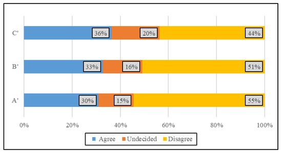 Regarding respondents’ conception of the role of school curricula in teaching students the concept of biodiversity, the results in Figure 2 show the dominance of the three proposed responses “B”, “C”, and “D”.