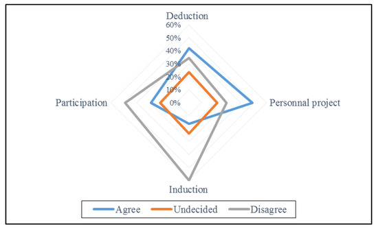 While the majority of teachers disagree on the contribution of school curricula in the development of specific knowledge (Figure 2), they recognize their importance in contributing to the development of practical skills (how to do), strategic skills (how to be), and personal qualities (how to act) for the protection of biodiversity and the establishment of a balanced relationship between man and nature (Figure 3).